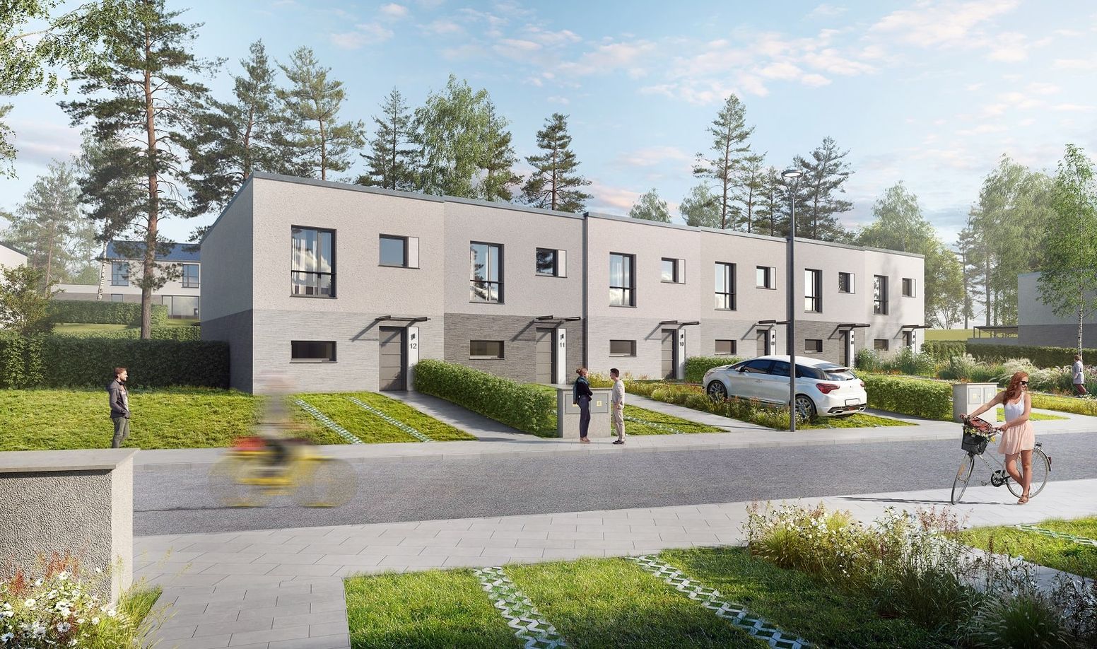 Solitérní rodinné domy: Většina solitérních domů je ve fázi základových desek. Vzorový dům (RD č. 3) je již kompletně dokončen — stavebně uzavřen, s finální fasádou, provedenými rozvody, podlahovým topením, omítkami, podlahami i osazeným vybavením. Objekt slouží jako ukázkový dům.